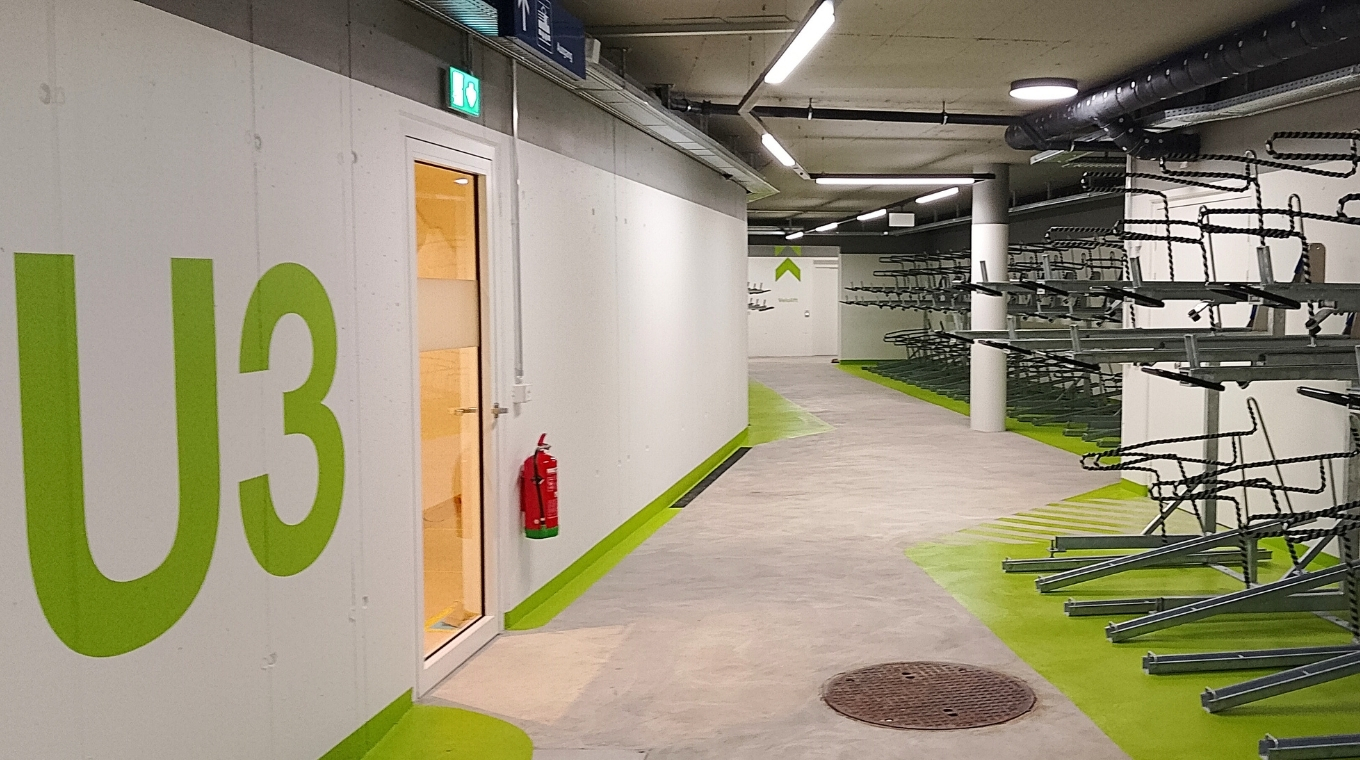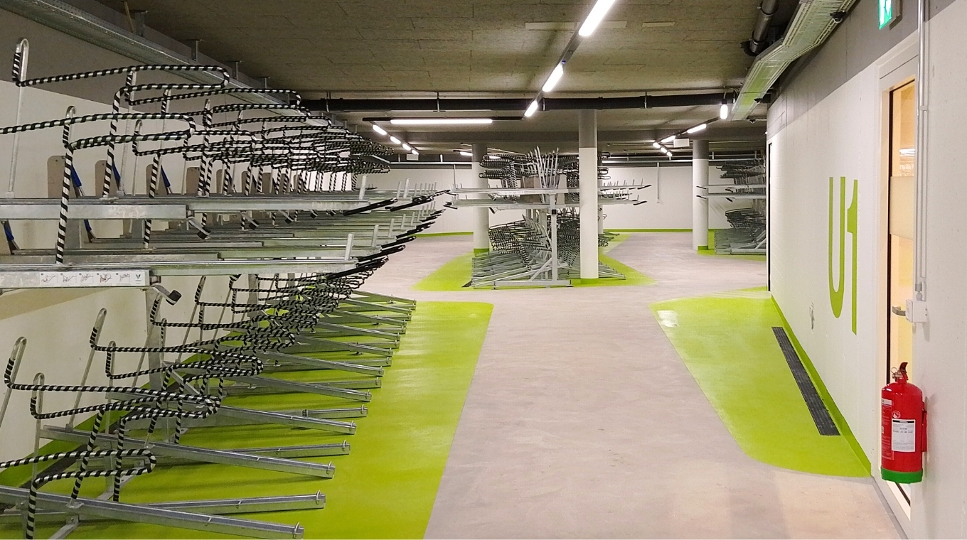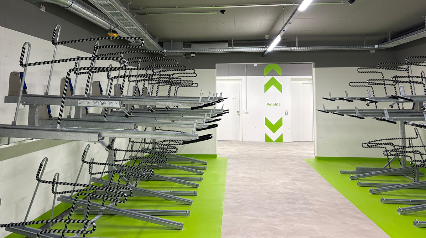 Les envi­ron 800 places de sta­ti­on­ne­ment à deux éta­ges offrent des pos­si­bi­li­tés de sta­ti­on­ne­ment sécu­ri­sées sur les trois niveaux sou­ter­rains, avec une capa­cité maxi­male sur une sur­face com­pacte. La faci­lité d’uti­li­sa­tion et l’ac­cès à la gale­rie mar­chande de Sta­del­ho­fen sont idéaux pour les navet­teurs. Avec cette vélo­sta­tion, la ville de Zurich encou­rage sys­té­ma­ti­quement l’uti­li­sa­tion du vélo et inves­tit dans une infra­struc­ture de mobi­lité dura­ble et tour­née vers l’avenir.